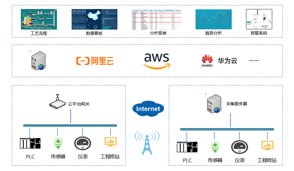 數(shù)據(jù)采集:支持Linux及Windows操作系統(tǒng),可以軟件方式安裝在PC機、服務器,也可嵌入到通訊設備盒子中??赡苤苯訌脑O備、PLC系統(tǒng)、DCS系統(tǒng)、工業(yè)SCADA系統(tǒng),OPC Server等中采集數(shù)據(jù),并向上層工業(yè)數(shù)據(jù)庫或者云平臺上傳,可以所采集的數(shù)據(jù)基礎上,實現(xiàn)協(xié)議轉換及必要的邏輯運算,以達到優(yōu)化數(shù)據(jù)傳輸目的。