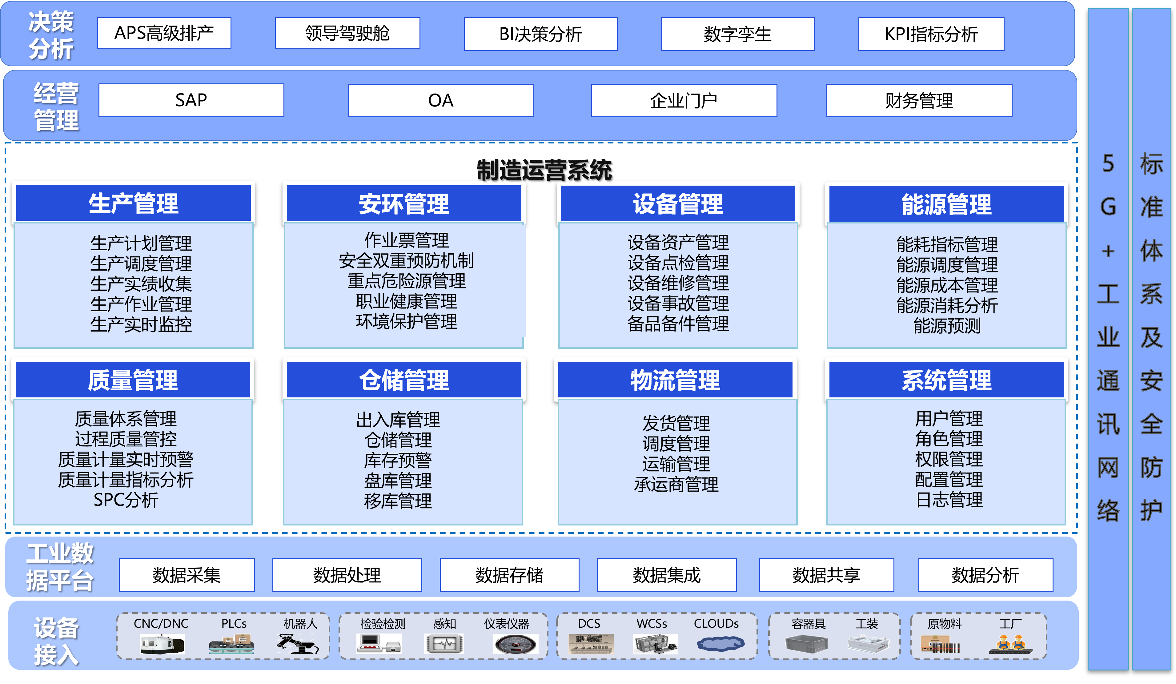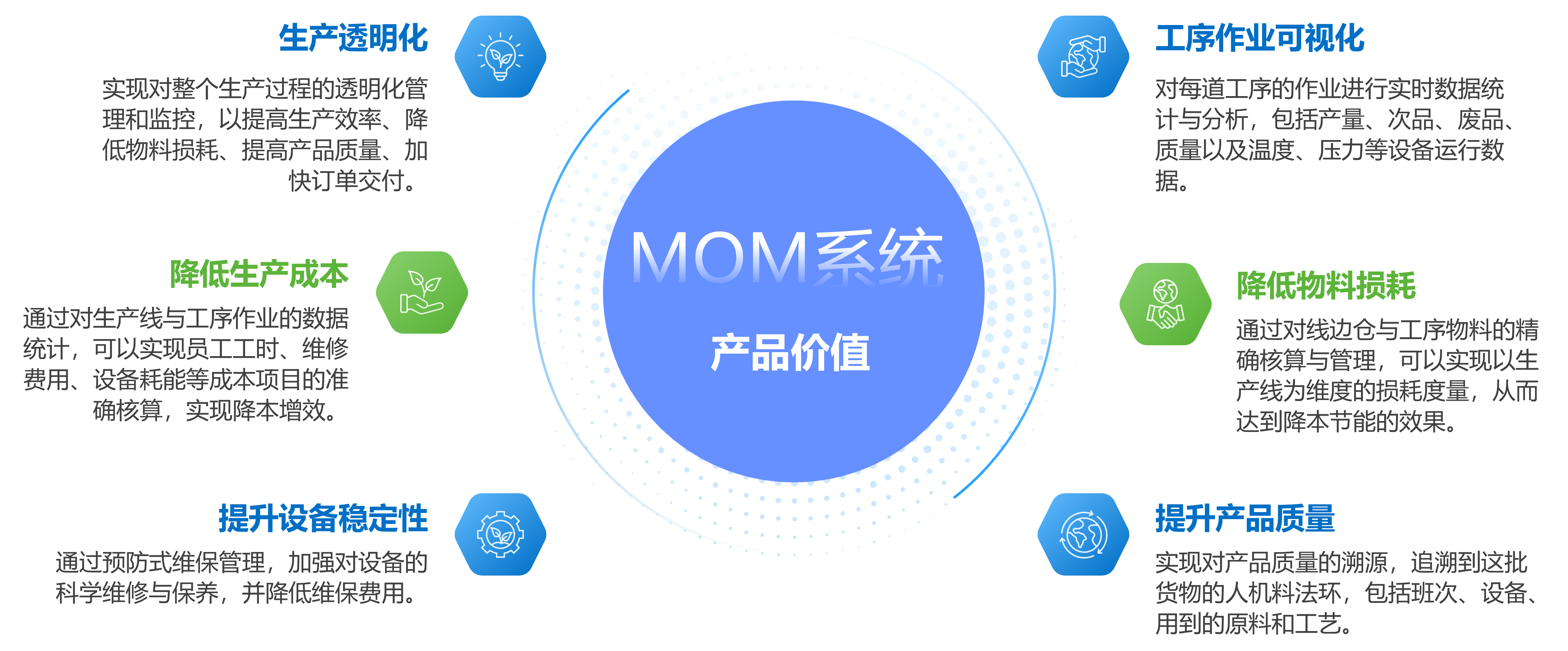 通過MOM制造運(yùn)營系統(tǒng)的應(yīng)用,企業(yè)實(shí)現(xiàn)生產(chǎn)過程的透明化管理,關(guān)注生產(chǎn)過程各環(huán)節(jié)的高效協(xié)同,以推進(jìn)企業(yè)的精益管理和質(zhì)量持續(xù)改善。通過整合企業(yè)制造運(yùn)營全鏈條數(shù)據(jù)信息,打破各環(huán)節(jié)信息孤島,賦能企業(yè)建設(shè)數(shù)字化工廠,幫助制造企業(yè)解決生產(chǎn)管理過程中存在的各類問題,從而使生產(chǎn)運(yùn)營高度協(xié)同,幫助企業(yè)提升精益管理水平,實(shí)現(xiàn)數(shù)字化轉(zhuǎn)型。