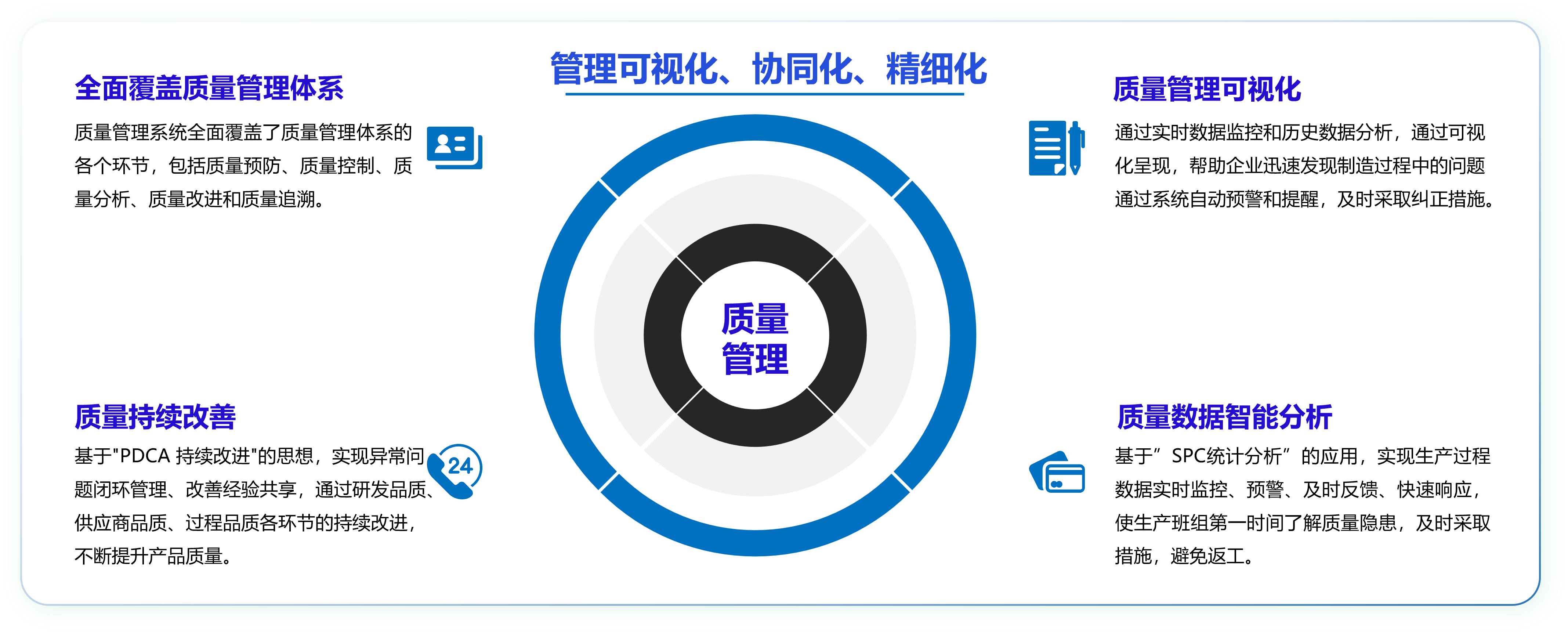 QMS是基于ISO體系管理要求設(shè)計(jì)開發(fā)的全過程質(zhì)量管理信息系統(tǒng)。旨在幫助制造企業(yè)實(shí)現(xiàn)質(zhì)量管理的持續(xù)改進(jìn)與提升,提升產(chǎn)品質(zhì)量及質(zhì)量可靠性,實(shí)現(xiàn)質(zhì)量成本精細(xì)化管理。