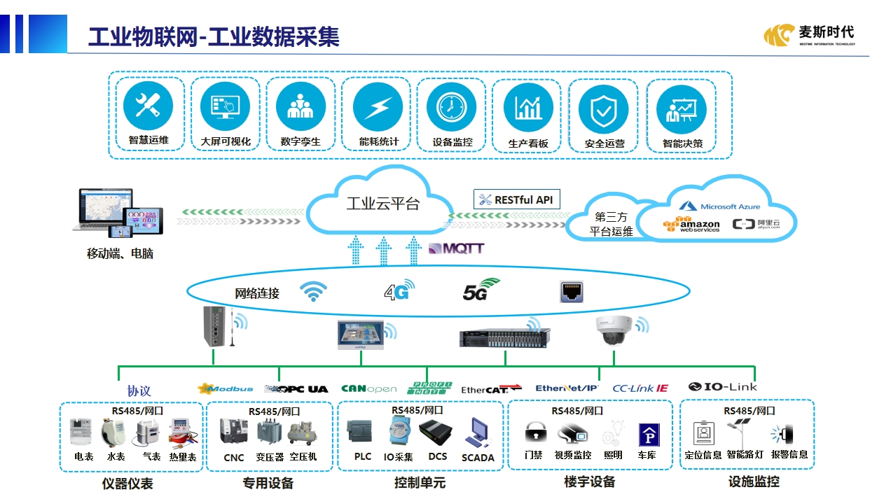 數(shù)據(jù)采集層包括云平臺(tái)網(wǎng)關(guān)(Internet、4G/5G),采集服務(wù)器(Internet)。協(xié)議支持有Modbus、OPC UA/DA等,設(shè)備支持有PLC、傳感器、第三方系統(tǒng)等。