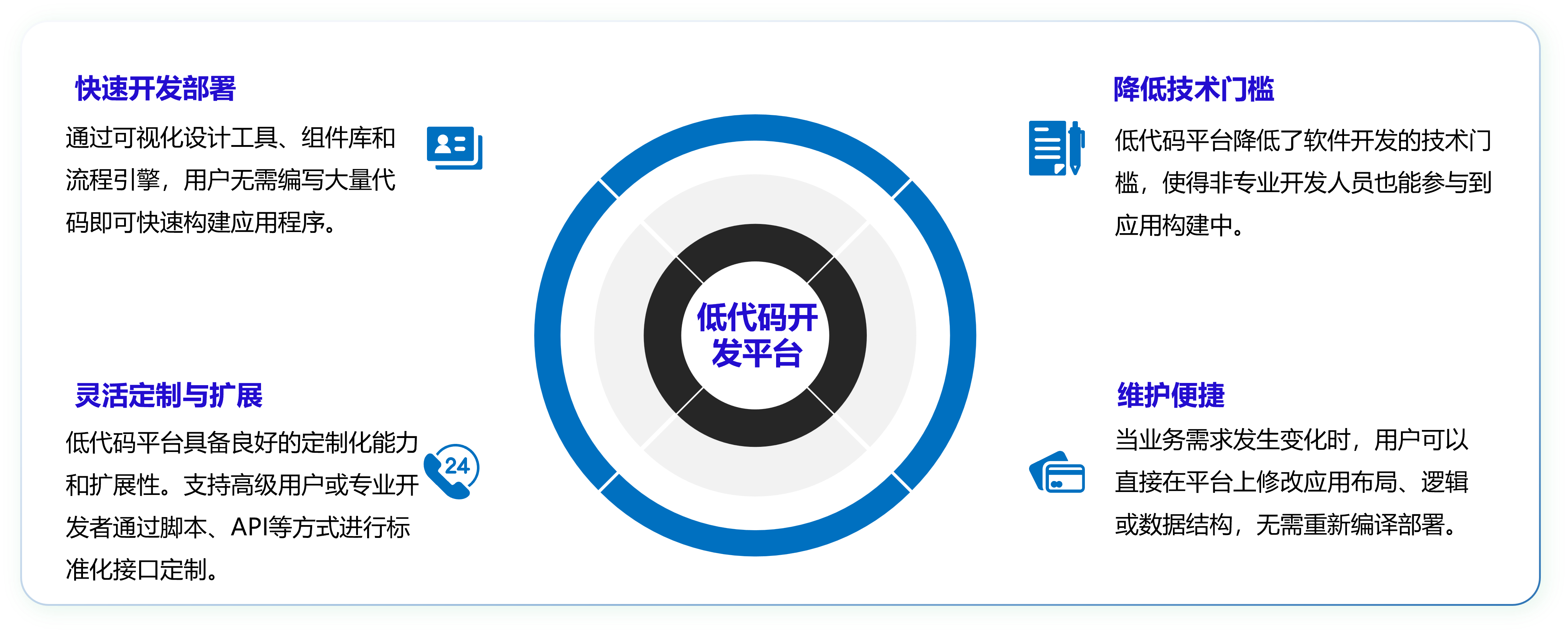 低代碼開發(fā)平臺(tái)助力企業(yè)高效化、便捷化的構(gòu)建企業(yè)各種應(yīng)用系統(tǒng),提供一站式的技術(shù)服務(wù)與支撐,提升整個(gè)項(xiàng)目或系統(tǒng)開發(fā)效率,縮短整體的實(shí)施周期,為企業(yè)的降本增效提供保障。