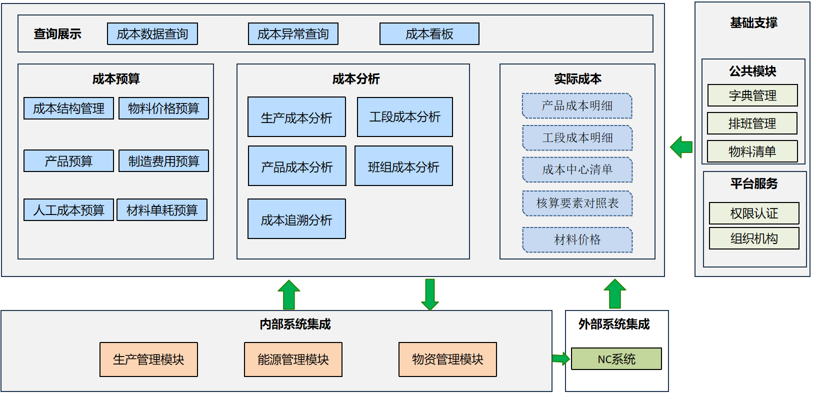 成本管理系統(tǒng)是面向生產過程的生產成本管理信息化系統(tǒng),是企業(yè)成本管理的核心環(huán)節(jié),聚焦于產品制造過程中所發(fā)生的各項費用,包括直接材料、直接人工和制造費用的歸集、分配與控制。其目標是通過科學的成本核算方法(如標準成本法、作業(yè)成本法等),自動采集生產流程中的?原輔料?、燃料動力消耗等生產過程數據,及時測算生產成本,通過多維度的成本分析準確計算單位產品成本,實時監(jiān)控生產過程中的資源消耗與成本偏差,幫助企業(yè)識別資源浪費,輔助優(yōu)化資源配置、?提升企業(yè)盈利能力,實現對生產成本的精細化管控與持續(xù)降低,從而保障企業(yè)盈利能力和運營效率。成本管理系統(tǒng)功能架構以數據驅動為核心,通過多層級模塊協(xié)同實現成本全生命周期管控,整體呈現 “基礎支撐 - 數據集成 - 核心運算 - 分析應用” 的遞進式結構。通過數據集成接口實現與 ERP、MES、WMS、財務等系統(tǒng)的無縫對接,自動獲取成本計算模型所需的各類數據。成本核算模塊采用作業(yè)成本法等精準方法,完成資源到作業(yè)、作業(yè)到產品的多級成本歸集與分攤。頂層通過成本分析、績效監(jiān)控與帳表管理模塊輸出價值,既能開展成本結構、預算差異等多維度分析,通過可視化儀表盤實現 KPI 預警與事中控制,又能自動生成成本匯總表、產品成本明細表等報表,為定價決策、流程優(yōu)化等提供數據支撐,形成 “事前計劃 - 事中監(jiān)控 - 事后分析” 的閉環(huán)管理。