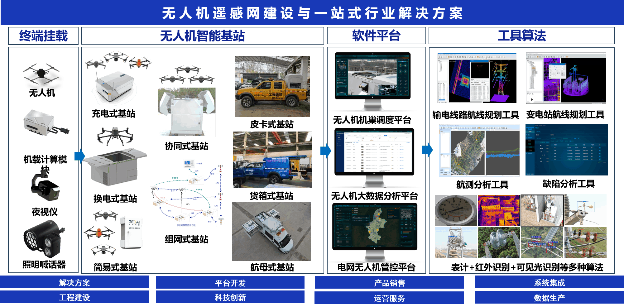 無人機(jī)智能巡檢系統(tǒng)包含無人機(jī)、無人機(jī)機(jī)場(chǎng)、飛行大腦和云端控制系統(tǒng)以及無人機(jī)管理調(diào)度平臺(tái),這些部分緊密的配合,得以實(shí)現(xiàn)無人機(jī)自主飛行、自主識(shí)別。