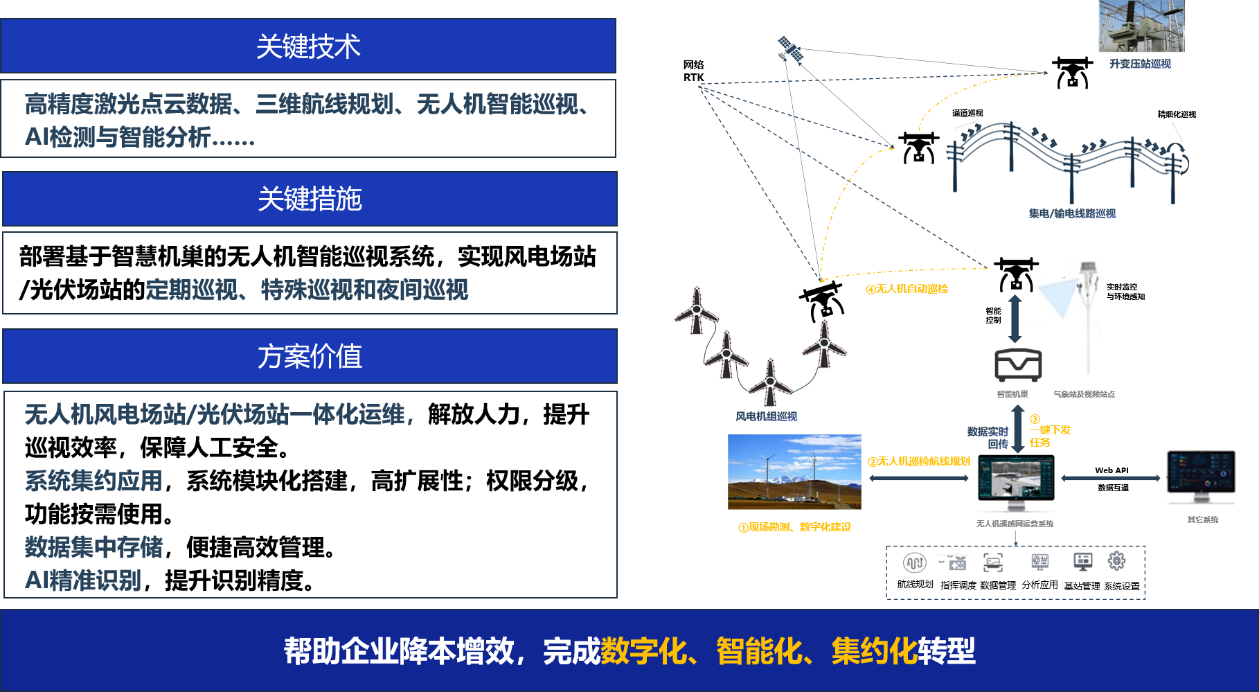 無人機(jī)巡檢比傳統(tǒng)人工巡檢方式更有效率,特別適合人工無法到達(dá)的困難地,可以大幅降低設(shè)備巡檢運(yùn)維成本,助理企業(yè)安全、高效、可靠的進(jìn)行各種場(chǎng)景的無人化巡檢,為企業(yè)的降本增效提供保障。
