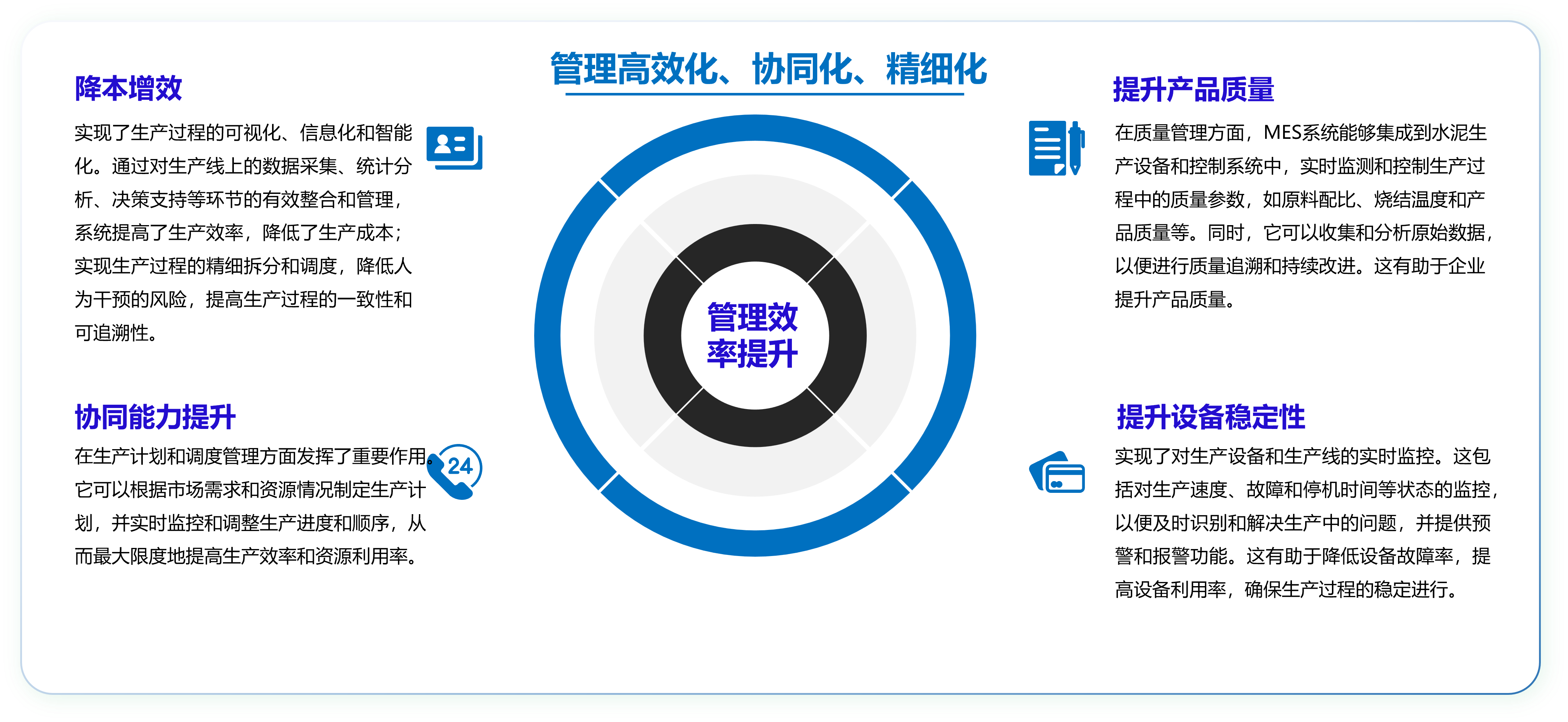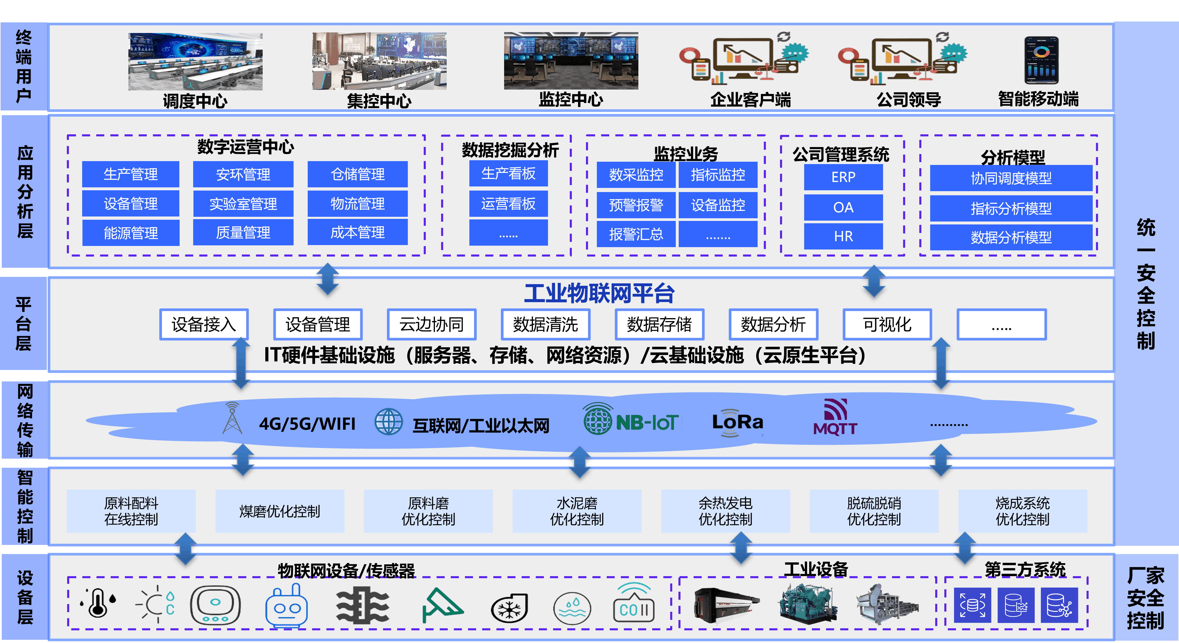 依據(jù)水泥行業(yè)的行業(yè)特點(diǎn)及工藝流程,結(jié)合企業(yè)各個(gè)業(yè)務(wù)部門的管理需求,融合企業(yè)精細(xì)化管理思想,以信息化技術(shù)賦能水泥行業(yè),打造集底層設(shè)備數(shù)據(jù)采集、業(yè)務(wù)數(shù)據(jù)對(duì)接、設(shè)備優(yōu)化控制、生產(chǎn)過(guò)程管理、能耗監(jiān)測(cè)、安全可視化、設(shè)備運(yùn)維便捷化、質(zhì)量管理最優(yōu)化的智能MES管理系統(tǒng),全方位提升企業(yè)生產(chǎn)管理能力及運(yùn)營(yíng)管理能力,實(shí)現(xiàn)企業(yè)節(jié)能降耗、提質(zhì)增效、減員降本的整體目標(biāo)。建設(shè)內(nèi)容主要包含:工業(yè)數(shù)據(jù)采集、工業(yè)數(shù)據(jù)平臺(tái)、先進(jìn)控制系統(tǒng)、生產(chǎn)管理、能源管理、安環(huán)管理、實(shí)驗(yàn)室管理、質(zhì)量管理、設(shè)備管理、倉(cāng)儲(chǔ)管理、成本管理、數(shù)據(jù)分析(數(shù)字孿生、領(lǐng)導(dǎo)駕駛艙、大數(shù)據(jù)析)。