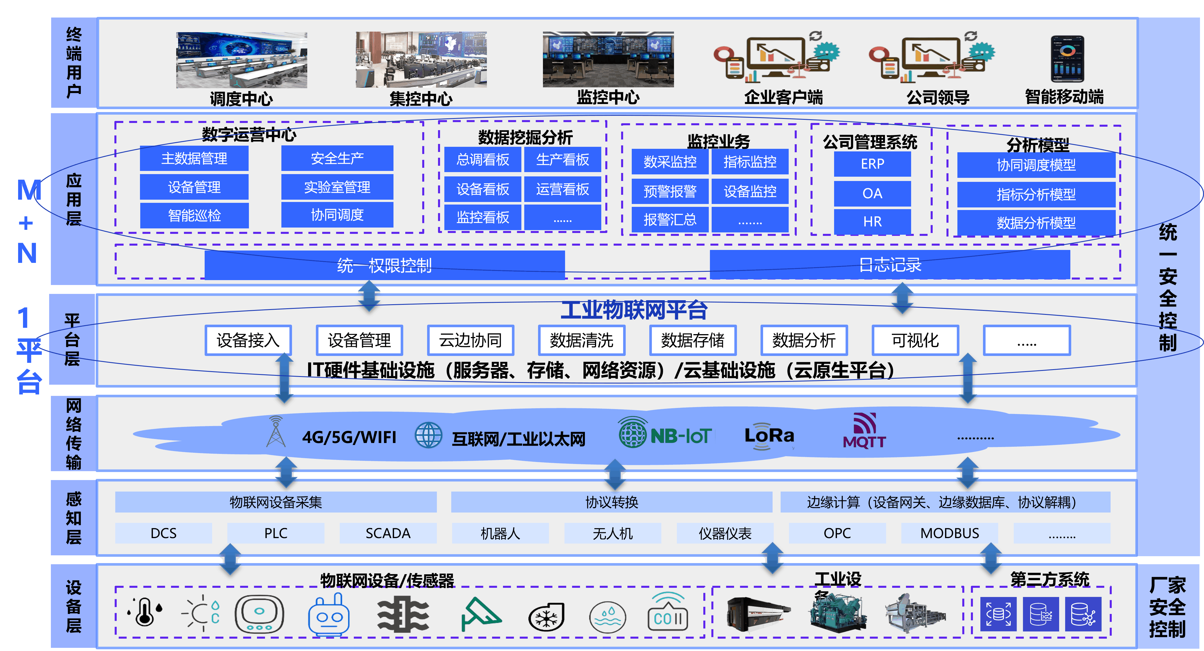 采用基于工業(yè)互聯(lián)網(wǎng)平臺的云、邊、端架構,構建設備層、感知層、網(wǎng)絡傳輸層、平臺層、應用層、分析展示層的6層架構模式;形成1個工業(yè)數(shù)據(jù)平臺+M個工業(yè)應用系統(tǒng)+N個算法模型的一體化平臺,依托于底層數(shù)據(jù)構建應用與算法,充分釋放數(shù)據(jù)的價值,打造企業(yè)側集數(shù)據(jù)采集、數(shù)據(jù)管理、業(yè)務管理、數(shù)據(jù)應用、數(shù)據(jù)分析的生產運營一體化平臺。參考架構如圖。