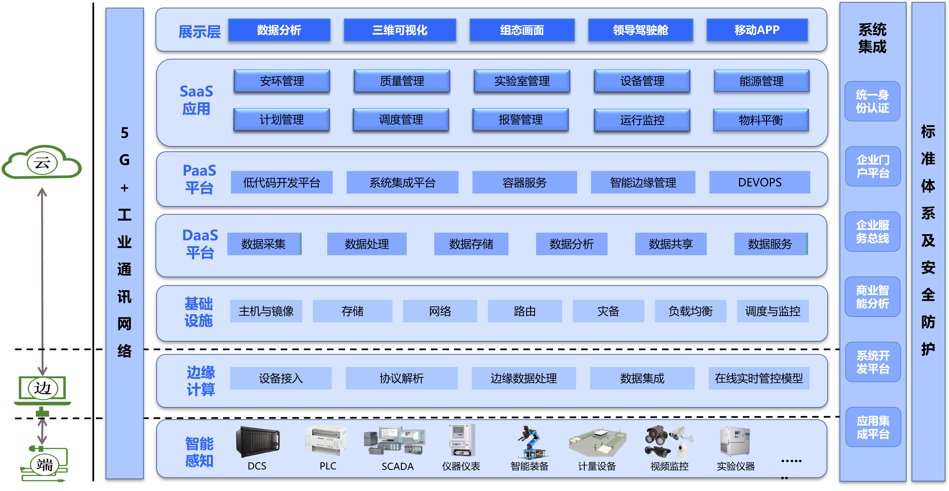 采用基于工業(yè)互聯(lián)網(wǎng)平臺(tái)的云、邊、端架構(gòu),構(gòu)建智能感知、邊緣計(jì)算、基礎(chǔ)設(shè)施、DaaS平臺(tái)、PaaS平臺(tái)、SaaS平臺(tái)、展示層的7層架構(gòu)模式;涵蓋生產(chǎn)過程數(shù)字化、生產(chǎn)執(zhí)行與智能調(diào)度、實(shí)驗(yàn)室管理、質(zhì)量管理、能源管理、設(shè)備管理、安全環(huán)保管理等業(yè)務(wù)域,打造數(shù)據(jù)采集、數(shù)據(jù)管理、數(shù)據(jù)應(yīng)用、數(shù)據(jù)分析為一體綜合性管控平臺(tái)。參考架構(gòu)如圖。