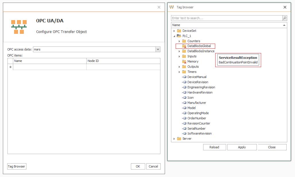 建立Connection階段,通過(guò)OPC UA/DA 的Tag Browser按鈕進(jìn)行標(biāo)簽瀏覽時(shí),無(wú)法查看DataBlocksGlobal 組下的標(biāo)簽,彈出錯(cuò)誤信息: